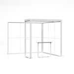 Den delvis takoverdekkede L-formen skaper en egen sone som både åpner opp og gir en viss grad av privatliv. Sideveggene med LED-belyste paneler danner et profesjonelt bakteppe for merkevaren din, mens taket over disken tilfører dybde og særpreg til standen.