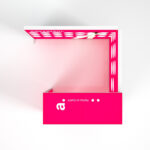 adFrame Smart 3×3 L er et moderne og funksjonelt messekonsept som kombinerer fire store, belyste adFrame Smart LED-paneler med en elegant, opplyst adTribune Smart LED SF-disk. Standen har en unik L-form med delvis tak, som skaper en semi-åpen møteplass med god tilgjengelighet og samtidig avgrenset presentasjonsområde.