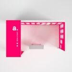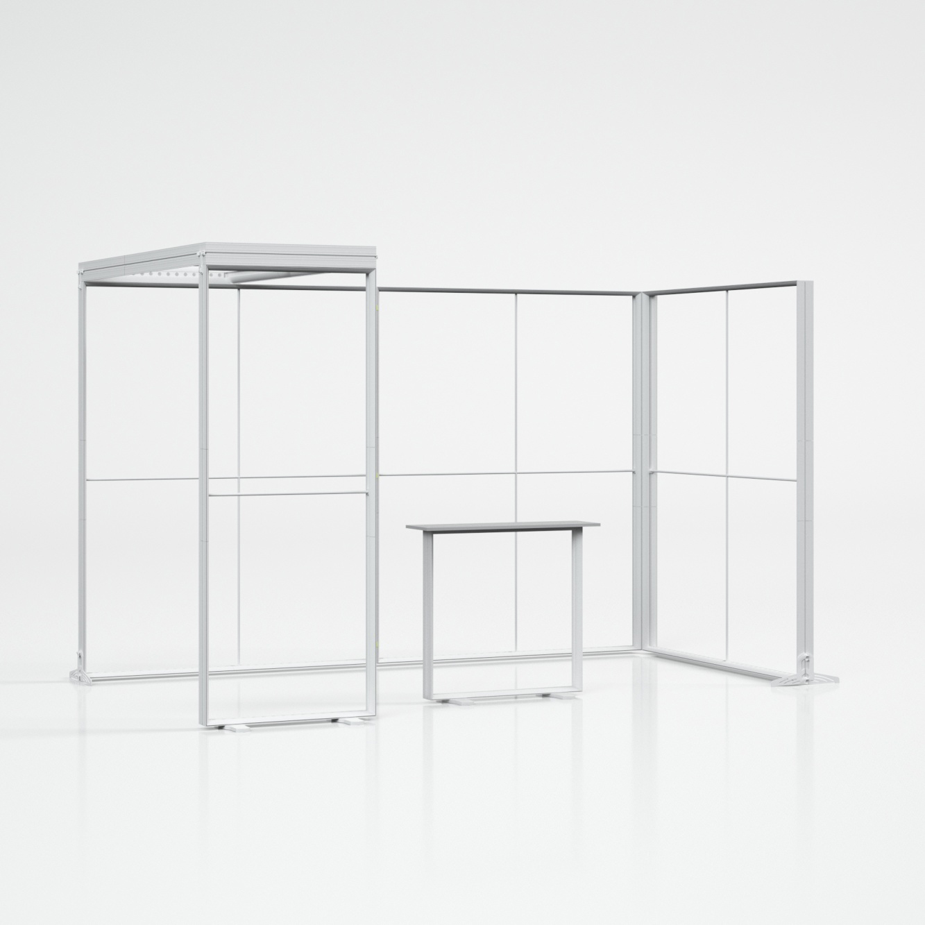 Denne standen skiller seg ut med en overbygget seksjon som skaper en imponerende inngangsportal. Den tydelige inngangen inviterer besøkende til å utforske standen og gir et definert messeområde.