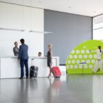 Resepsjon: adWall Vario Peak-veggen er perfekt for resepsjonsområdet og skaper en elegant bakgrunn med firmalogoen.